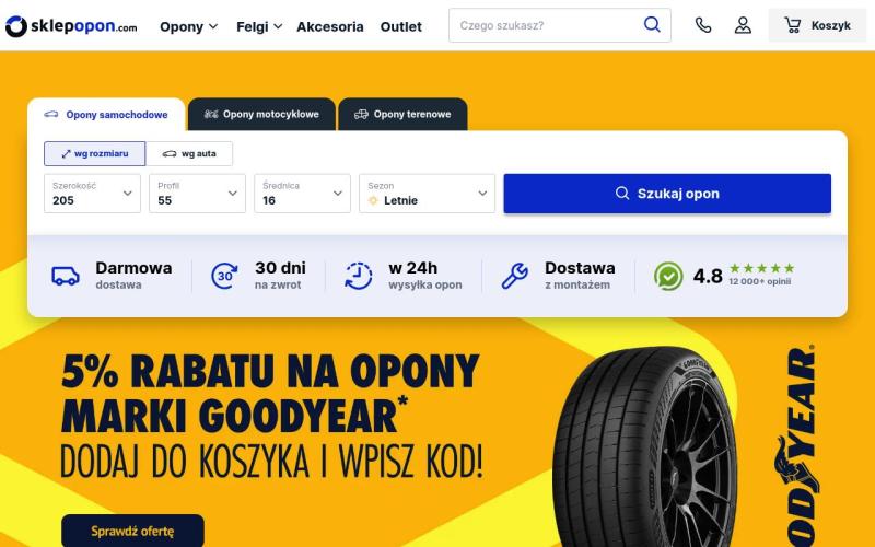 Sklep Opon (sklepopon.com) to jeden z wiodących polskich sklepów internetowych specjalizujących się w sprzedaży opon samochodowych. Oferuje bogaty asortyment opon letnich, zimowych i całorocznych dla samochodów osobowych, dostawczych i ciężarowych. W ofercie znajdziemy produkty uznanych marek takich jak Michelin, Bridgestone, Continental, Goodyear, Pirelli oraz wiele innych. Sklep wyróżnia się konkurencyjnymi cenami, szybką realizacją zamówień oraz profesjonalną obsługą klienta.