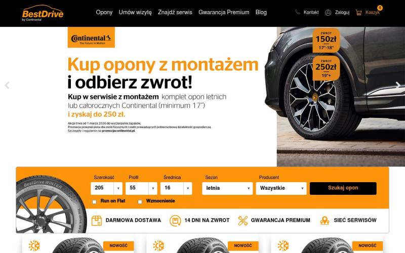 Bestdrive - один з найбільших мережевих магазинів автомобільних шин та дисків у Польщі. Компанія пропонує широкий вибір продукції провідних світових брендів: літні, зимові та всесезонні шини, легкосплавні та сталеві диски для легкових автомобілів, позашляховиків та комерційних транспортних засобів. У магазині також представлені супутні товари для автомобіля та професійні послуги з шиномонтажу. Bestdrive гарантує оригінальність продукції та привабливі ціни.