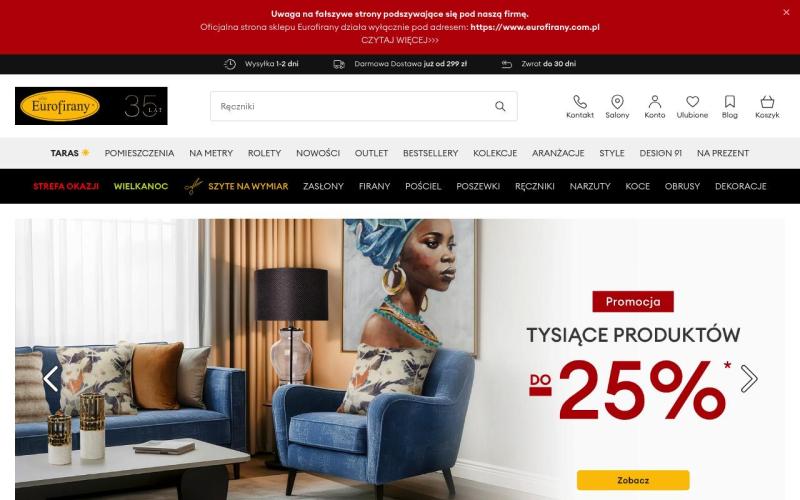 Eurofirany – один з найбільших виробників домашнього текстилю в Польщі з багаторічною історією. Магазин пропонує якісні штори, гардини, тюль, покривала, подушки та декоративні аксесуари для дому. Вся продукція відрізняється європейською якістю, стильним дизайном та доступними цінами. Eurofirany постійно оновлює колекції, слідуючи найновішим трендам в інтер'єрному дизайні.